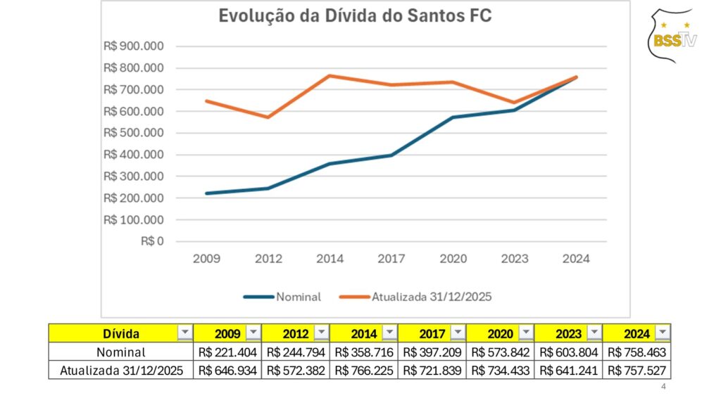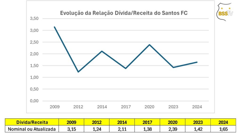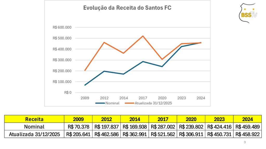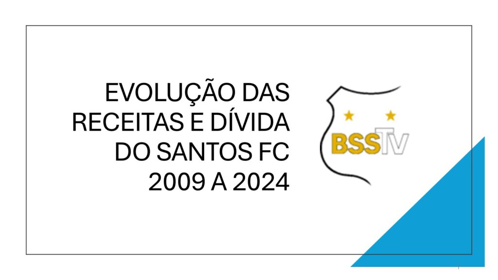 Este estudo mostra a evolução da receita, dívida e déficit entre 2009 e 2024. Abrange os dados do último ano completo de atuação de cada um dos presidentes do Santos FC neste século. Pela ordem: Marcelo Teixeira (2009), Luís Álvaro de Oliveira Ribeiro (2012), Odílio Rodrigues (2014), Modesto Roma Júnior (2017), José Carlos Peres/Orlando Rollo (2020), Andrés Enrique Rueda Garcia (2023) e novamente Marcelo Teixeira (2024).