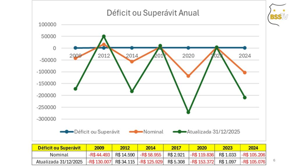 Segundo Giovane Martineli informou no Bom Dia Peixe de 12/03/2026 no canal do Diário do Peixe, o Santos deverá apresentar relatório com déficit de R$ 338 milhões em 2025.